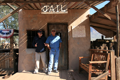 As we were walking down the street taking in all the sights Bob nudged me and said, "See that guy over there?" I looked where he was pointing and he said, "I know that guy." I didn't recognize anyone in the direction he was indicating. Just then the "sheriff" walked over to us to welcome us to Tombstone and Bob asked him if he knew the fella in question. The sheriff said, "Do you mean Kenny?" Bob looked at me with a big smile and said, "It's Kenny Bie(!), I knew I knew him!" The name clicked with me right away and we started walking in that direction. Halfway there Kenny looked in our direction and saw Bob and a big smile crossed his face. Bob worked with Kenny in the National Guard for many years. Who woulda thought we'd see somebody in Tombstone that we know! Here's Bob and Kenny.